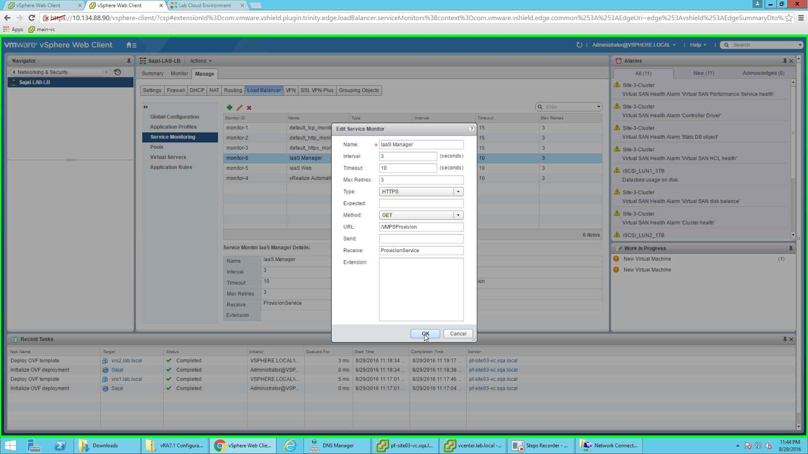 Next we need to configure Service Monitoring. This will enable LB to learn the status of the members (whether they are UP or DOWN), based on the status the traffic will be routed to the required node. So be very careful while configuring these. I did not notice an extra in a single line and result was my vRA Pool members were down. So no traffic was being routed to the main vRA portal. Once I cross checked the Service Monitoring configuration then I got it corrected. So be careful while configuring these (I know I am repeating this :) ) . Start this configuration by selecting "Service Monitoring" from left tab and clicking the green + sign from the new pane. I will create a total of 3 Service Monitors: