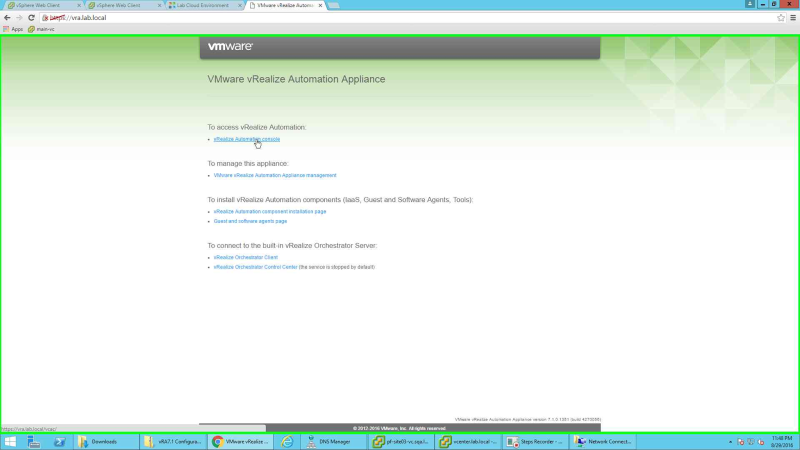 Once the vRA installation completes, you will be able to access it using the vRA url. In my case it is https://vra.lab.local